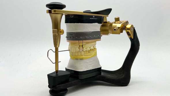 コンピューターによるお口の中の間接的なスキャン(CAD)と精密な削りだし(CAM)。患者さま一人ひとりのお口の状態に合わせた専用の土台を製作し、それにより美しいスマイルラインを作り出しています。